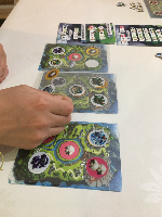 Chaque joueur reçoit 4 feuillets transparents. Parmi les 4, on en conserve un qu'on applique sur l'une des îles. Les autres feuillets sont transmis au voisin, par un système de draft. Cela ajoutera des dragons, des oeufs, des moutons sur les emplacements en les recouvrant.