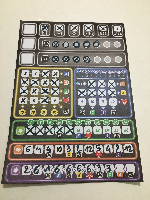 On trouve également 6 dés colorés (blanc, bleu, vert, jaune, orange, violet).